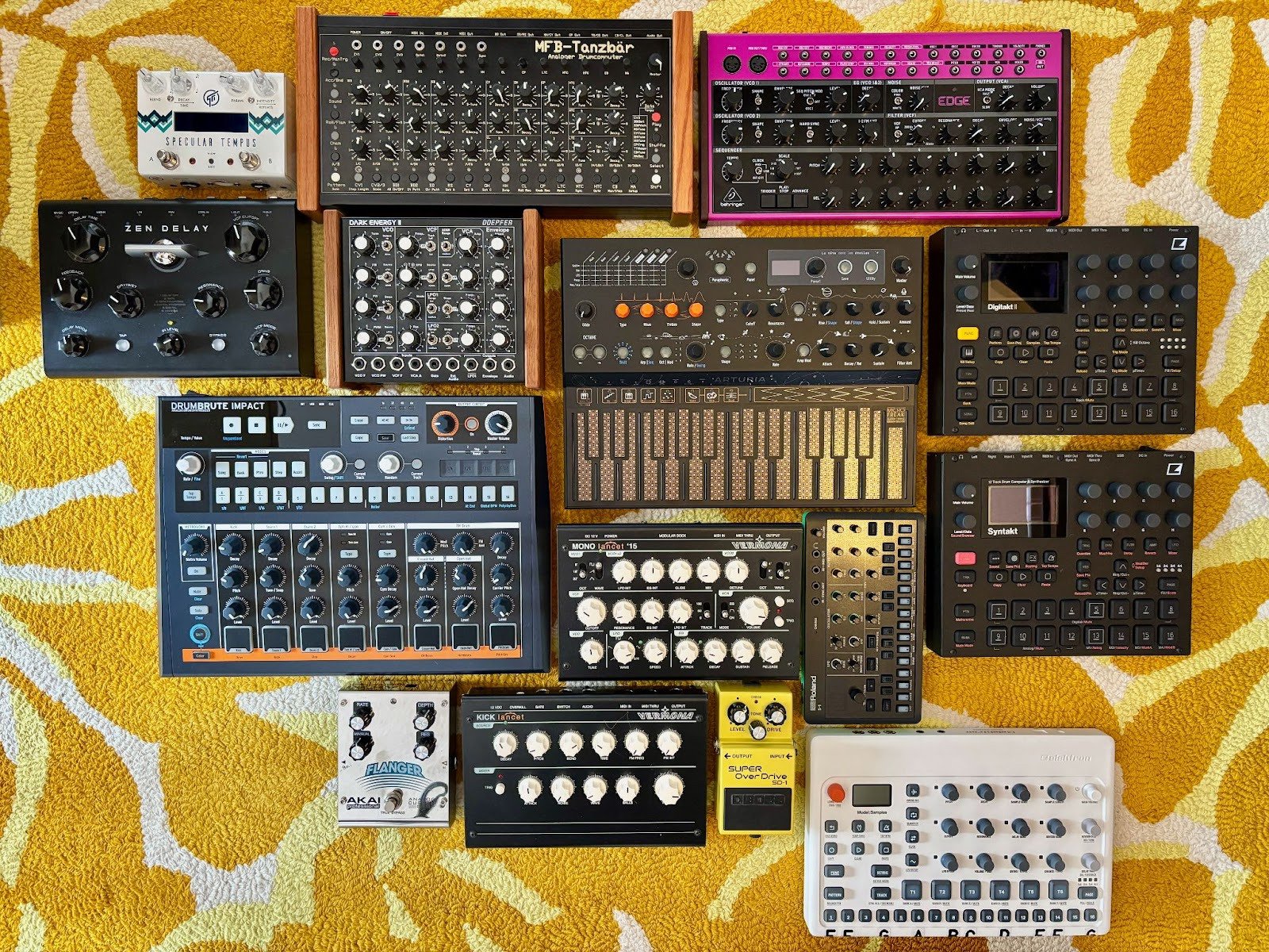 - FX & Outboard: Akai MFC42, Erica Synths Zen Delay, Akai Flanger (Custom Shop), Boss SD-1, Specular Tempus, plus shakers and percussion.
